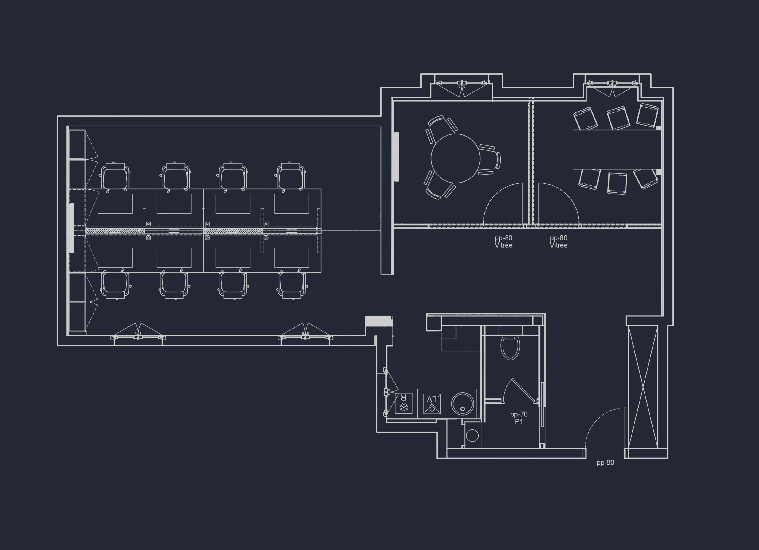 L’espace, initialement cloisonné et peu lumineux, a été restructuré en profondeur afin de rationaliser la circulation et de créer des zones modulables et cohérentes, capables d’évoluer selon les besoins des équipes.
