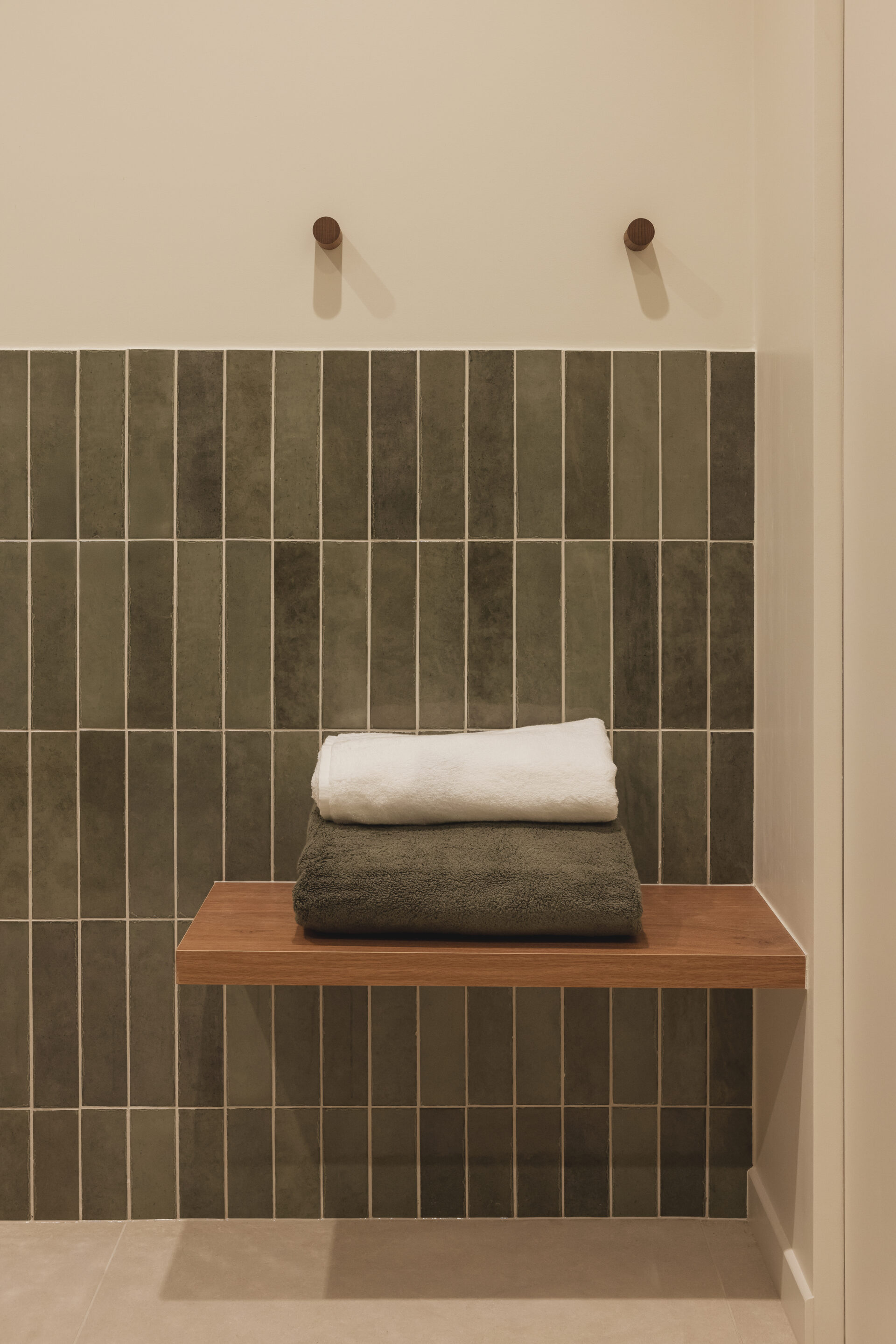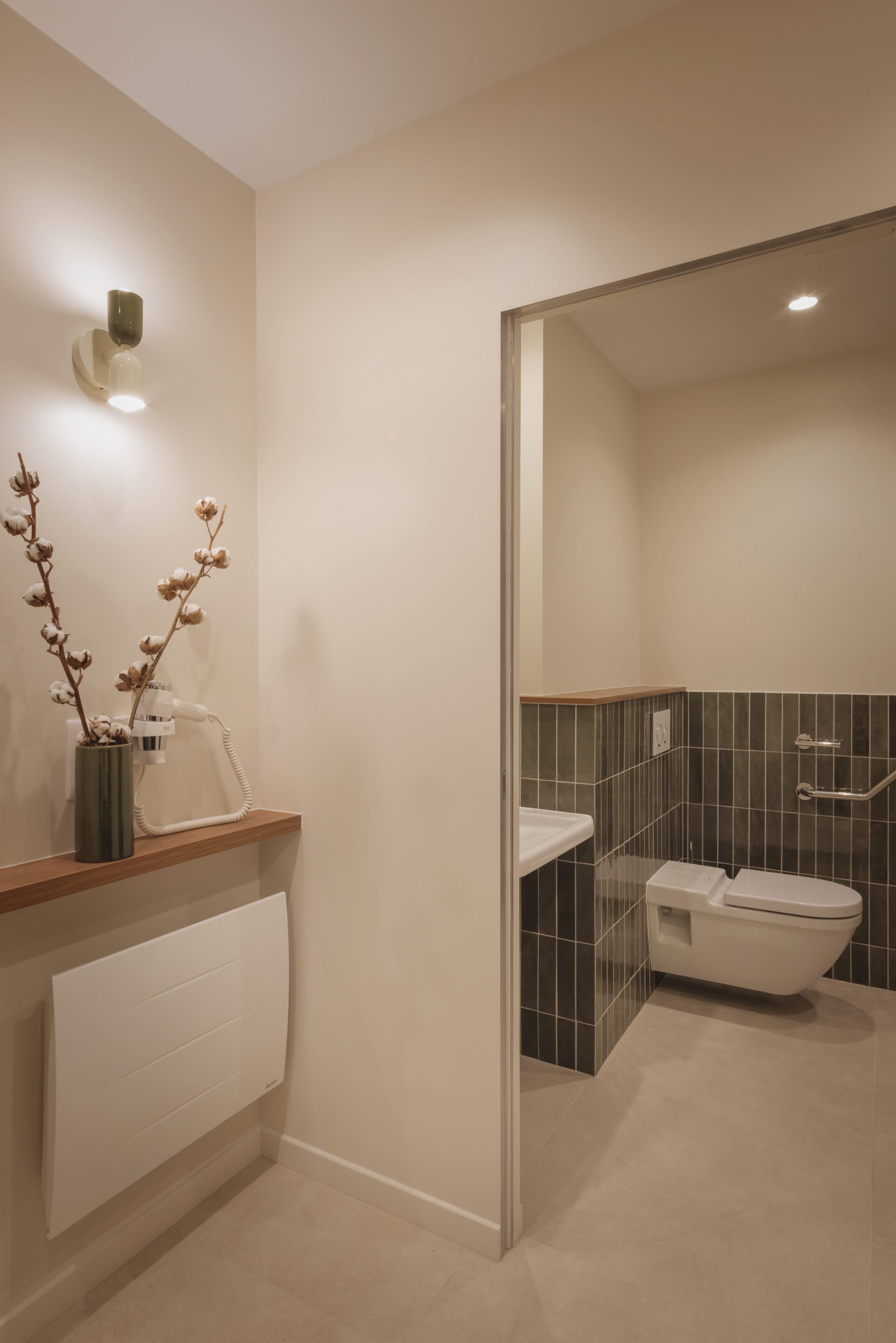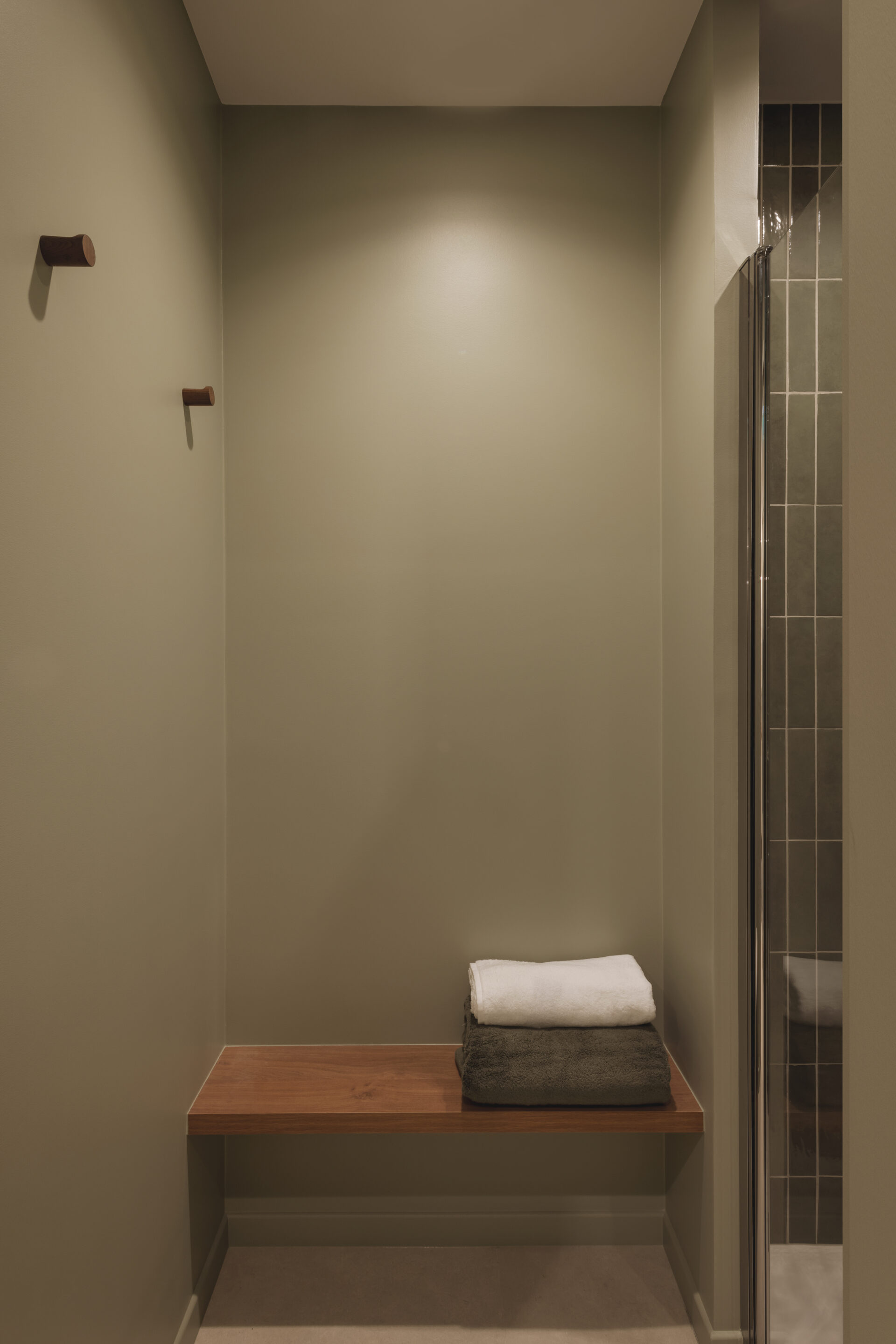 Les matériaux s’inspirent du minéral et du végétal, en résonance avec l’identité du bâtiment. Les teintes douces, les finitions bois et la lumière soigneusement calibrée composent une atmosphère feutrée, propice à la déconnexion.